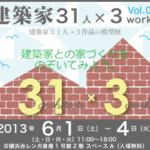 2013年5月31日 / 最終更新日 : 2020年5月11日 角倉 剛 □お知らせ 「建築家31人×3works vol.9 」 今週末から開催 6/1〜6/4に横浜赤レンガ倉庫1号館2階スペースAで開催の「建築家31人×3works vol.9 」に参加します。 建築模型の展示と建築の相談会をおこないます。 私は土曜日と日曜日の2時以降に会場におります。よろしけ […]