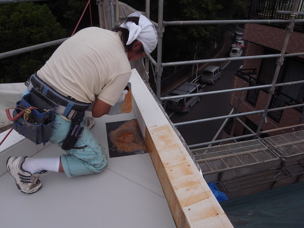 この日は、屋上の防水工事。防水はシート防水で、